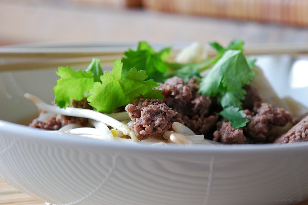 Öl in einen Topf geben und das Hackfleisch anbraten, Ingwer hinzugeben. Sojasauce, Miso und Brühe hinzufügen. 2-4 Minuten kochen lassen und mit Chilisauce abschmecken.