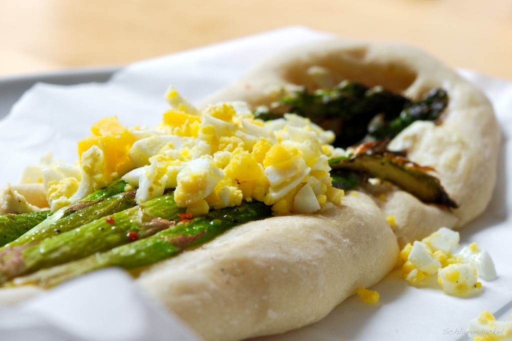 Den Teig in 4 Stücke teilen und auf wenig Mehl länglich formen, so dass der Spargel gut drauf passt. Den Ricotta auf dem Teig verteilen und leicht mit Salz und Pfeffer würzen. Den Spargel drauflegen und die Fladenbrote ca. 10 Minuten backen. Ich hab nach dem Backen noch etwas gehacktes Ei drübergestreut.
