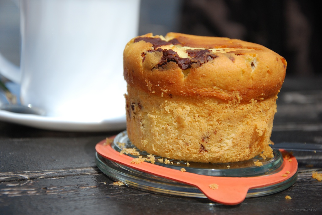 Die Butter mit Frischkäse, Zucker und Vanillezucker cremig rühren. Die Eier nach und nach unterrühren. Das Mehl mit dem Backpulver mischen und unter die Käsecreme rühren. Die Schokoraspel mit einem Löffel locker unterheben. Den Teig in die Gläser füllen und auf dem Rost (Mitte) 35-40 Minuten backen.