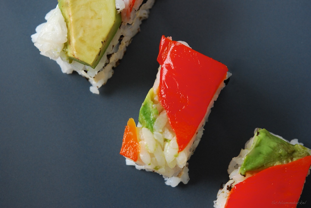 Ich bin ein großer Sushi-Fan! Selbermachen ist immer ein Ereignis: Ich muss zum Fischladen, zum Asialaden, eine reife Avocado jagen. Aber wenn ich dann alles beisammen habe, ist die Vorfreude groß. Wer erst noch Fan werden möchte, kann ja erstmal vegetarisch anfangen. Im Schicht-Sushi ist kein einziger Fisch drin und kunstvoll rollen müsst ihr auch nichts. Die vorbereiteten Zutaten werden einfach nur in eine Form geschichtet und dann in Würfel geschnitten.