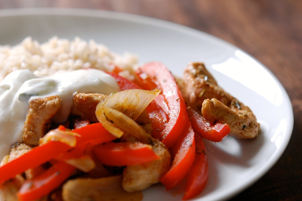 Paprika, Zwiebel und Fleisch in Streifen schneiden. Das Fleisch ca. 4 Minuten anbraten, Gewürze zugeben und Fleischstreifen wieder herausnehmen. Dann Paprika und Zwiebel ungefähr 10 Minuten in die Pfanne geben, 1 bis 2 Minuten vor Ende das Fleisch wieder dazugeben. Nochmal abschmecken und dann auf jeden Fall mit Tzatziki essen.