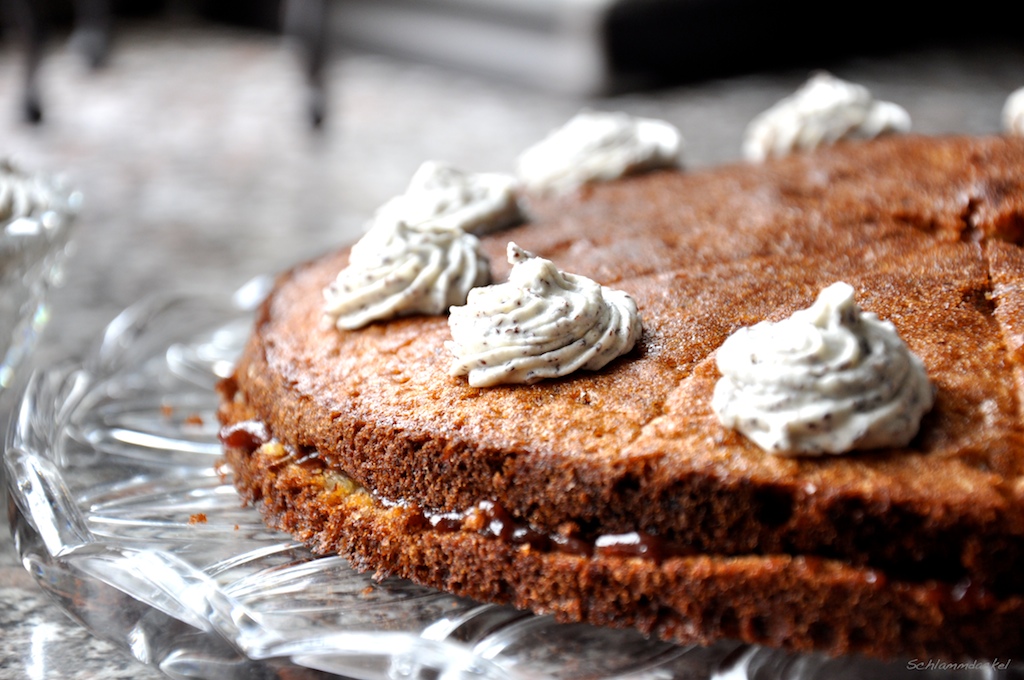 Mein Beitrag zu dieser Torte besteht zwar nur aus dem Anbringen der Mohnsahne-Tupfen und dem anschließenden Verzehr, aber ich verbreite das Rezept trotzdem. Die war nämlich sehr lecker und ist ungemein unkompliziert. Der Boden lässt sich prima schon am Vortag backen, der Zusammenbau ist schnell gemacht und das Endprodukt sieht nach mehr Arbeit aus als es eigentlich war.