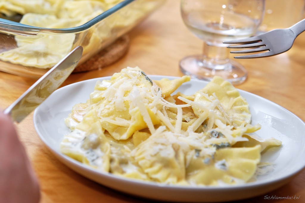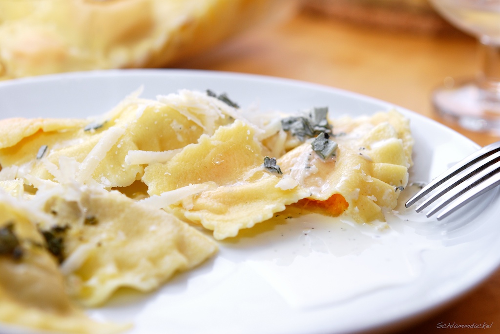 Hier sind die gestern erwähnten Ravioli. Habe zu Weihnachten Leila Lindholms Kochbuch „Noch ein Stück“ bekommen. In dem Buch empfiehlt sie eine Salbeisauce mit Vanille zu selbstgemachten Ravioli. Weil auch ein dickes Bündel Vanilleschoten unter meinen Geschenken war, wollte ich die Sauce unbedingt ausprobieren. Sie roch erst ganz stark nach Vanille, aber als dann der Salbei und Parmesan dabei waren, war die Vanille nur noch zu erahnen. Zu den Hackfleisch-Ravioli fand ich sie nicht ganz so passend, aber zu denen mit Ricotta bzw. Ricotta und Süßkartoffel schmeckte sie prima!